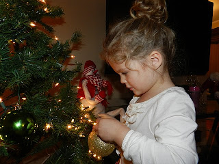 concentrating very hard to put the ornament (or as she would say, 'lantern' on the tree.)